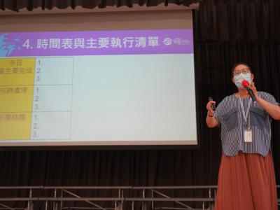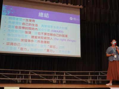 本校邀請將軍澳靈實醫院健康服務處社工,為中五和中六級同學主講名為「有效的時間管理策略」的講座。此講座提醒同學利用時間表溫習的重要性,並且講解了如何才能切實執行。同學在講座後均表示能夠有效安排及運用時間,減少他們出現焦慮的情況,從而能積極面對文憑試的挑戰。