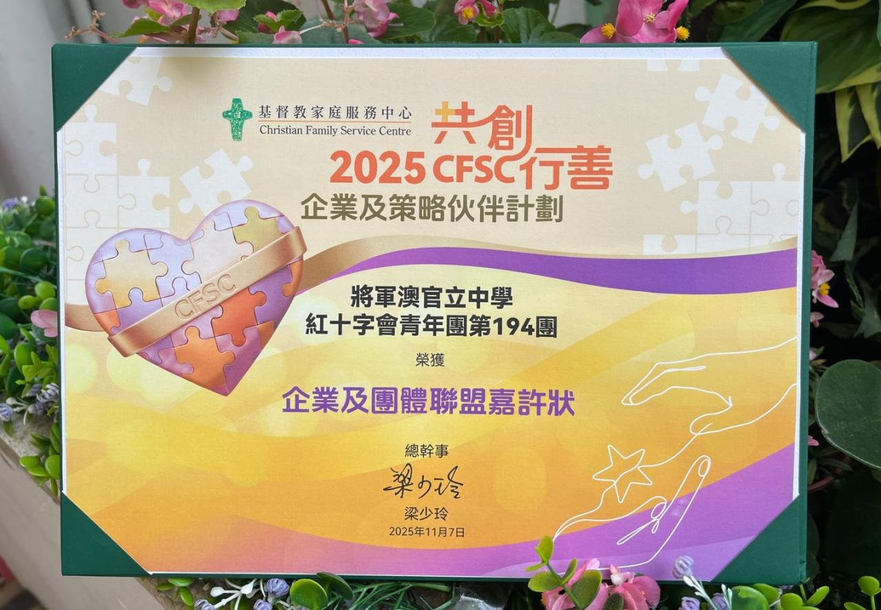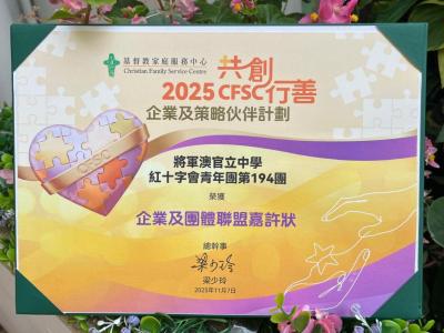 Members of the Red Cross Team (YU194) of our school were awarded a Certificate of Commendation from the Christian Family Service Centre for their outstanding performance in elderly services this year. They received this award for visiting elderly people and providing wheelchair assistance at elderly community centers during the school holidays.