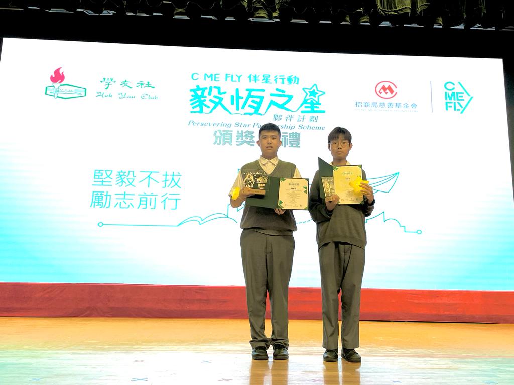 恭喜6A LEE CH同學及4D LAI HL同學獲得由學友社舉辦的「C ME FLY 伴星行動毅恆之星夥伴計劃」所頒發之「毅恆之星」奬項,計劃旨在嘉許學生堅毅面對成長中各種挑戰、積極求進,及以個人的故事和經歷,推廣堅毅不拔丶逆境自強的精神。