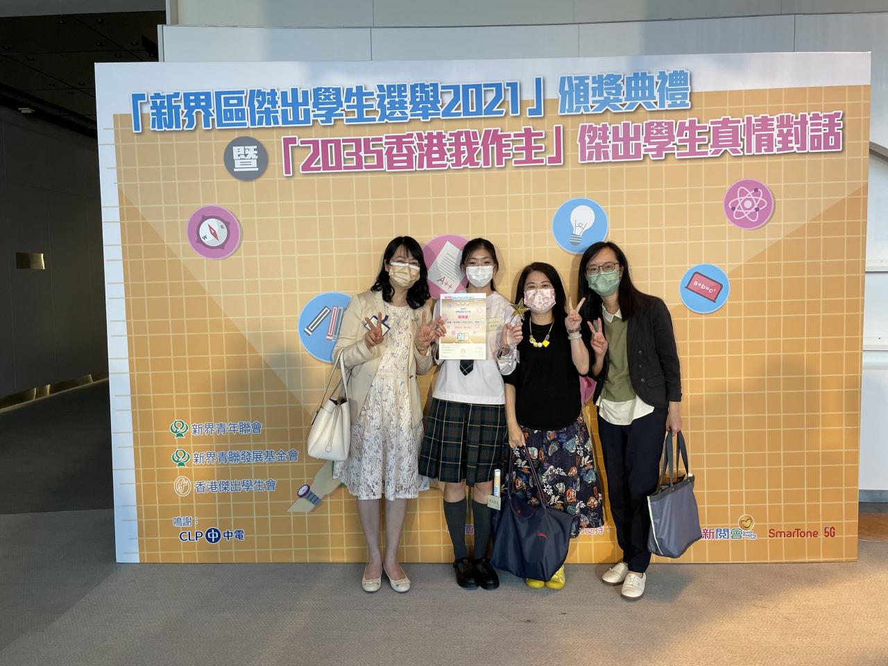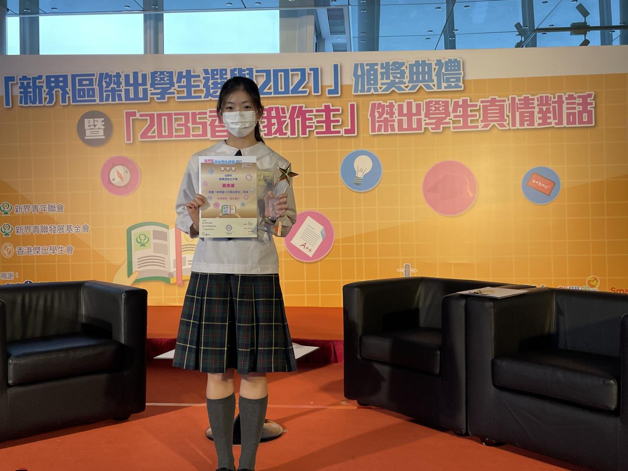 30 October 2021中四級黃泆溱同學在新界青年聯會舉辦的「新界區傑出學生選舉」中獲選為「新界區十大傑出學生」,是次選舉由新界九大區,共150所中學,派出1100位同學參加。大會先在衆多參賽者中,選出46位「地區傑出學生」,入圍總決賽的學生再須經過筆試、長答題、短片創作比賽、個人面試及小組面試,結合多方面評分後,才選出「新界區十大傑出學生」。足見黃同學是次獲獎是她個人努力、家庭裁培和學校教育的共同成果。