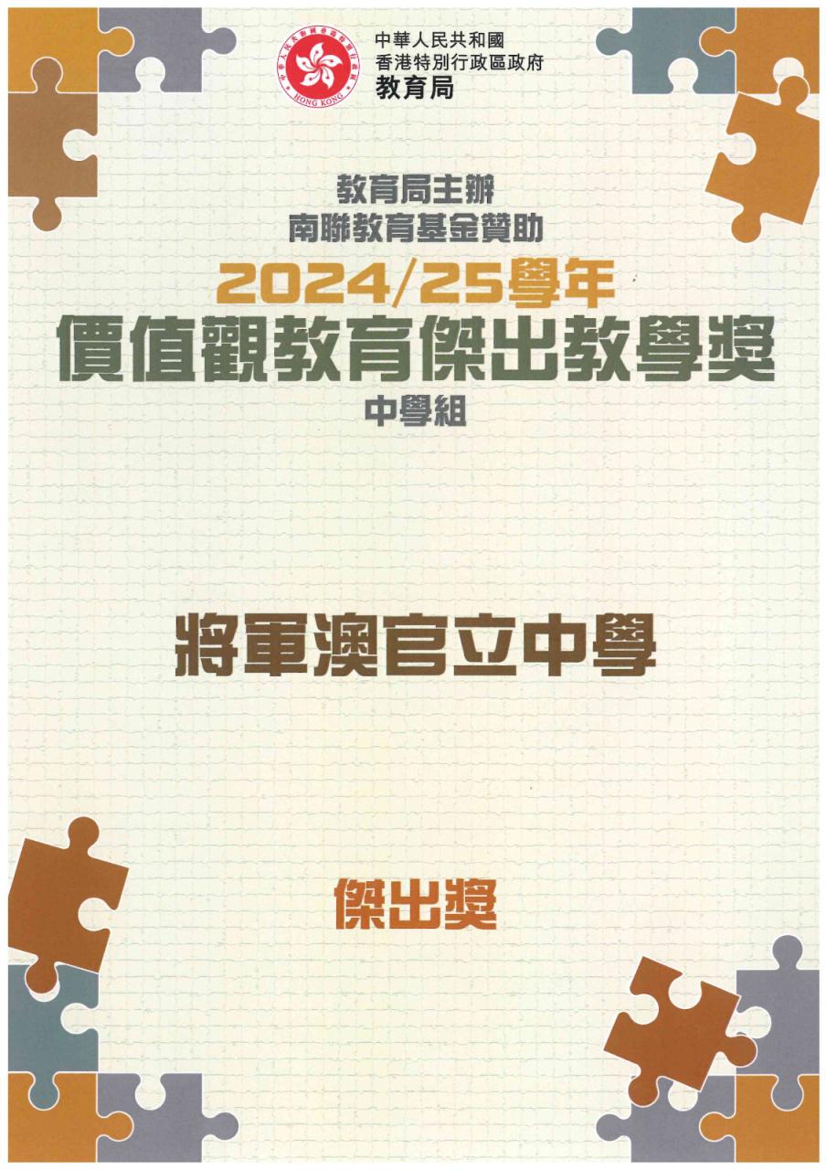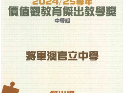 同時,本校亦榮獲「2425價值觀教育傑出教學獎-中學組」傑出獎,這份榮譽屬於全校師生共同努力的成果。