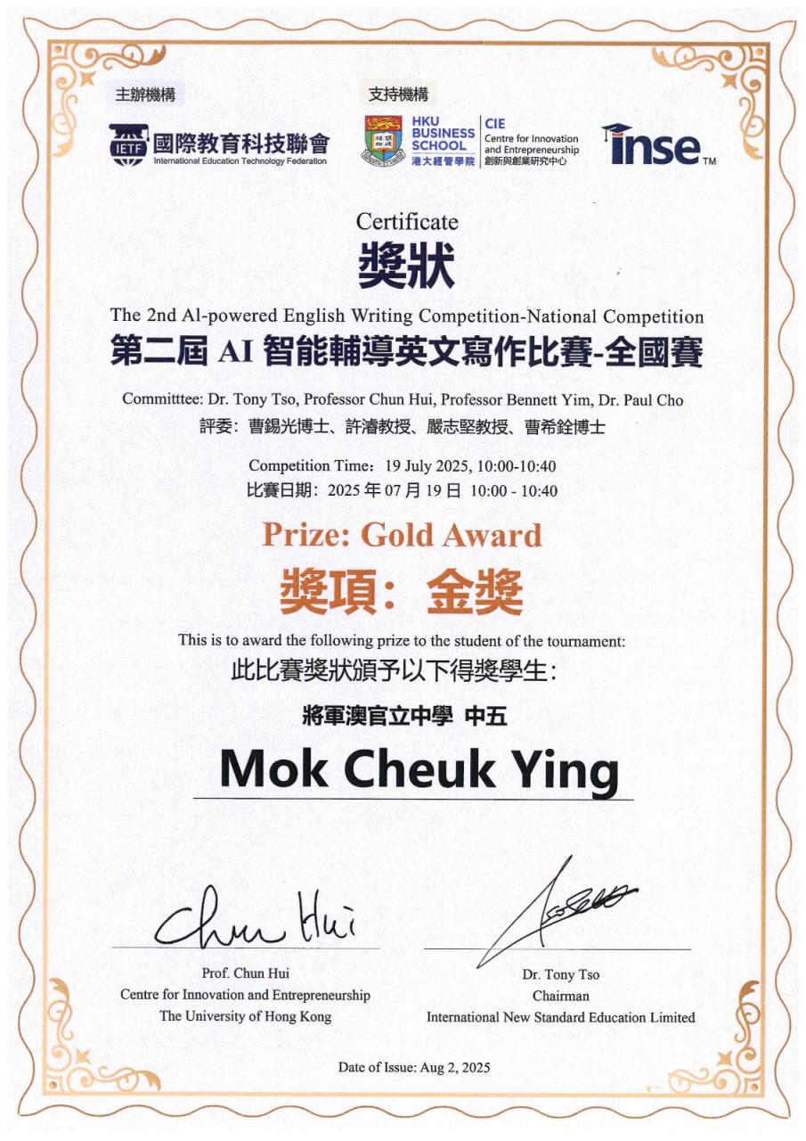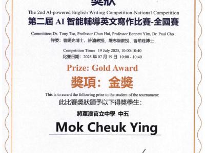 第二屆AI 智能輔導英文寫作比賽 全國賽 - 金奬